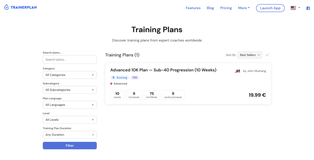 Listing page — trainerplan.co/training-plans — with filters by type of activity, subcategory, price and duration. Buyers see the title of the plan, your name as the author, the price, and a short description.