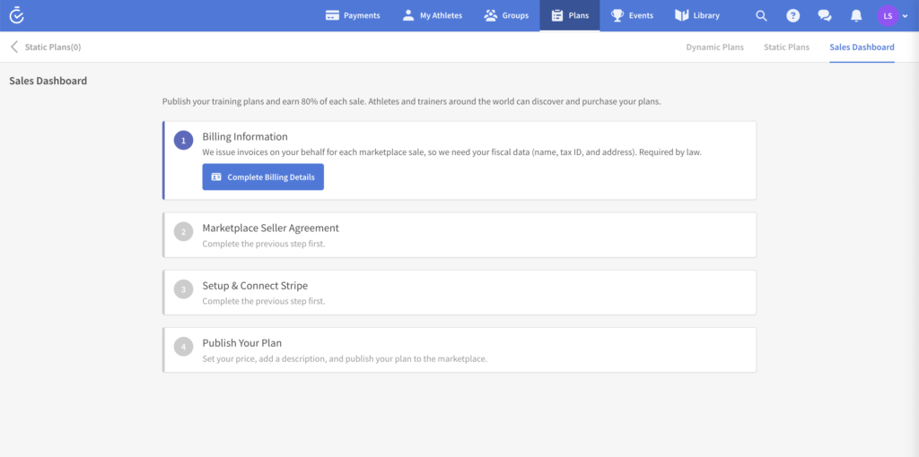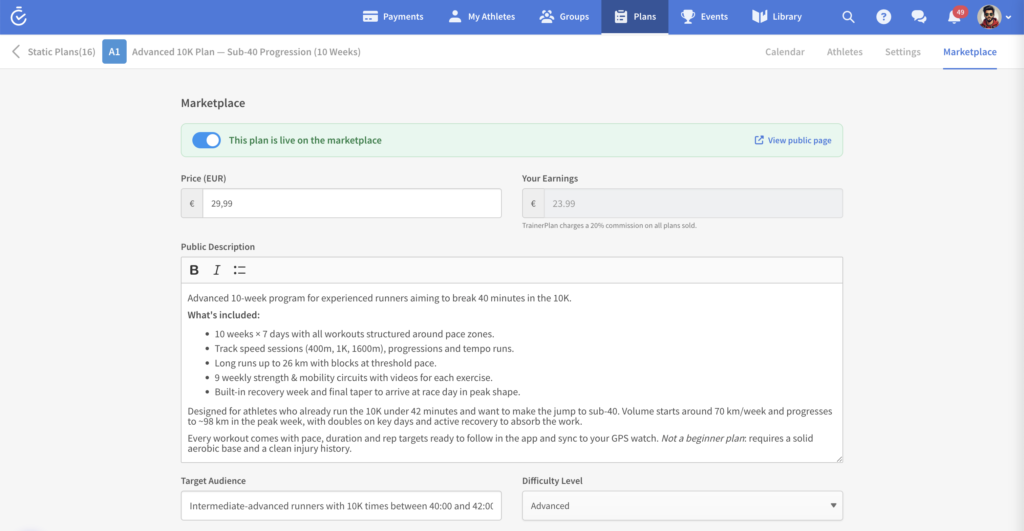 The TrainerPlan Marketplace allows you to publish your static training plans and sell them to athletes and coaches from all over the world. TrainerPlan handles payments, taxes (VAT) and billing on your behalf. you keep 80% of each sale (post-VAT); TrainerPlan retains 20% as the margin to operate the platform.