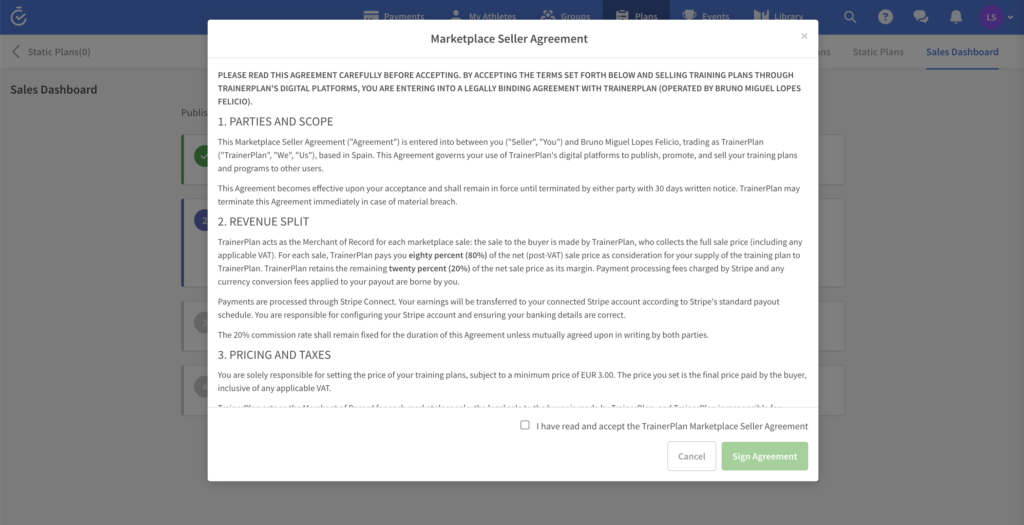Read and sign the agreement. Section 3.B authorizes TrainerPlan to issue self-billing invoices on your behalf — this is what makes your data from step 1 legally usable.