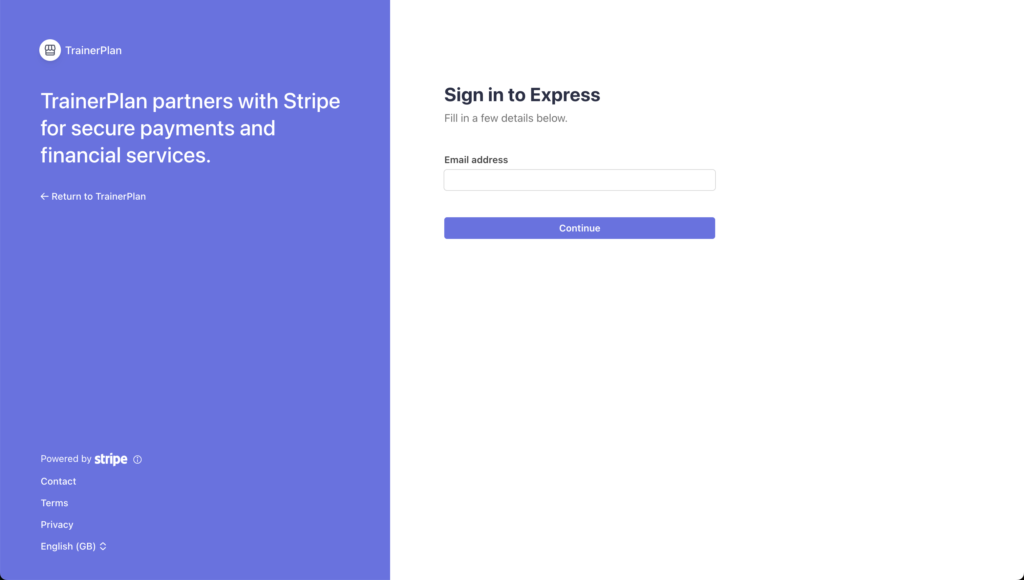 Click Connect with Stripe to complete the identity verification and add your bank details. This is where your earnings will be deposited. Stripe manages everything — you will be redirected to your secure form and return to TrainerPlan upon completion.