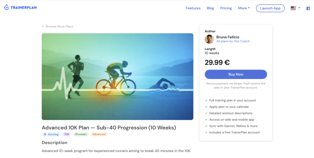 Detail page — trainerplan.co/training-plans/plan-name — full description, sample week (if you added it), activity details, your author bio, and a Buy now button that takes the buyer to the secure checkout.