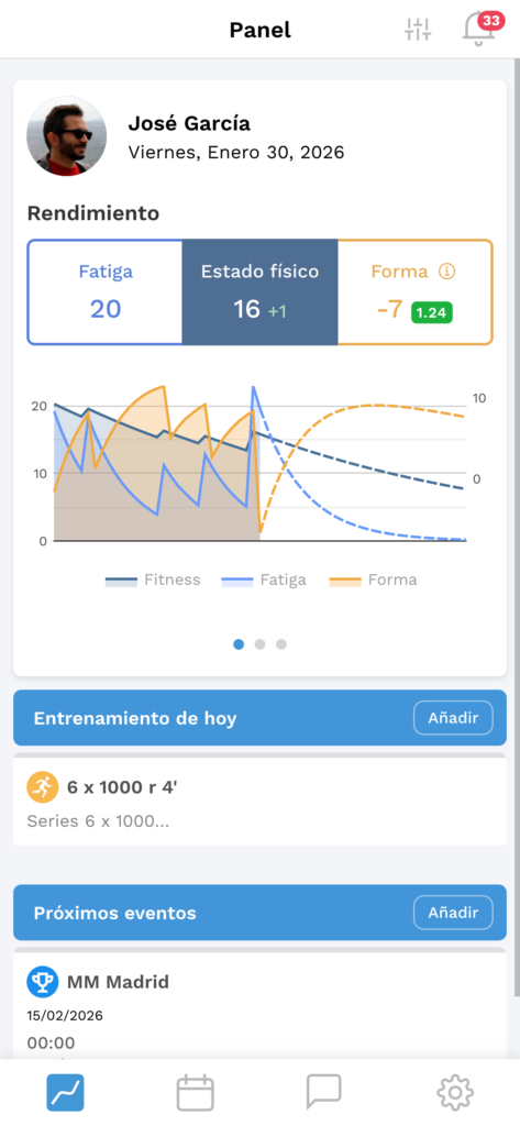 El Panel de Control es donde puedes ver el detallado gráfico de rendimiento o performance para ayudarte a seguir y planificar la carga de entrenamiento para tus atletas.