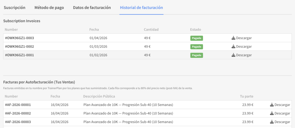 Ambas facturas están disponibles para descargar en tu pestaña Perfil → Facturación → Historial de Facturación.