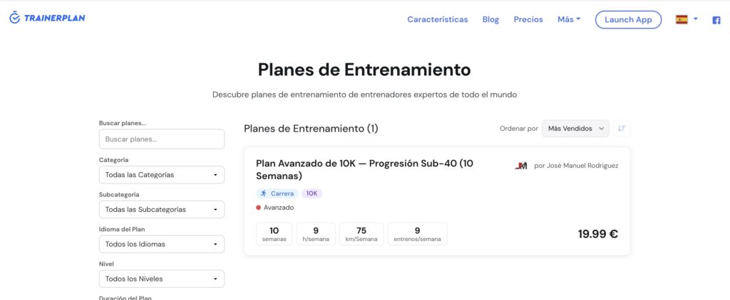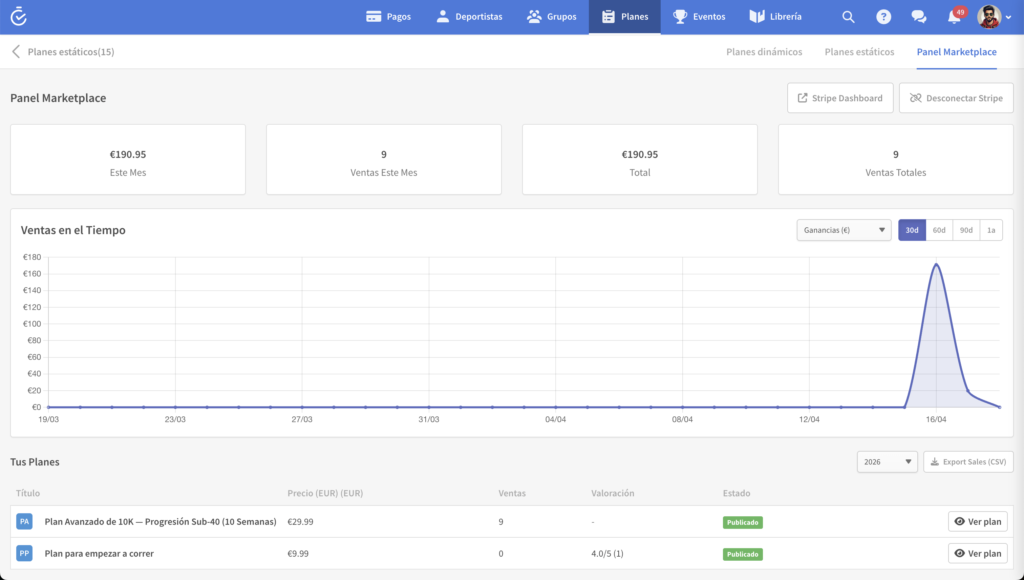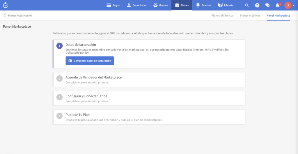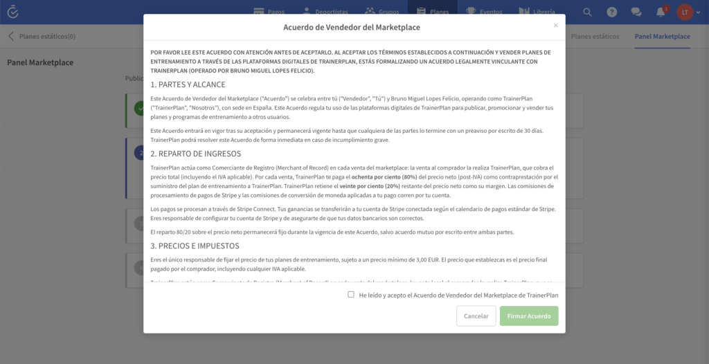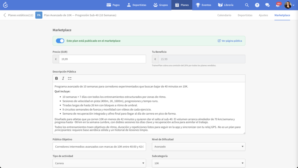 El Marketplace de TrainerPlan te permite publicar tus planes de entrenamiento estáticos y venderlos a atletas y entrenadores de todo el mundo. TrainerPlan se encarga de los pagos, los impuestos (IVA) y la facturación en tu nombre. Tú te quedas con el 80% de cada venta (post-IVA); TrainerPlan retiene el 20% como margen por operar la plataforma.