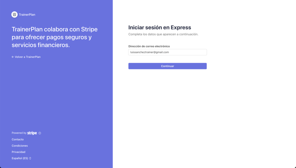 Haz clic en Conectar con Stripe para completar la verificación de identidad y añadir tus datos bancarios. Aquí es donde se depositarán tus ganancias. Stripe gestiona todo — serás redirigido a su formulario seguro y volverás a TrainerPlan al terminar.
