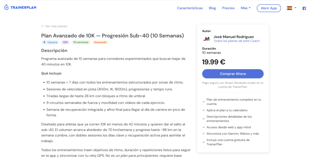 Página de detalletrainerplan.co/training-plans/nombre-del-plan — descripción completa, semana de muestra (si la añadiste), detalles de la actividad, tu biografía como autor, y un botón de Comprar ahora que lleva al comprador al checkout seguro.